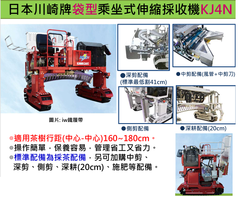 標準配備為採茶配備,另可加購中剪、深剪、側剪、深耕犁(20cm)等配備。